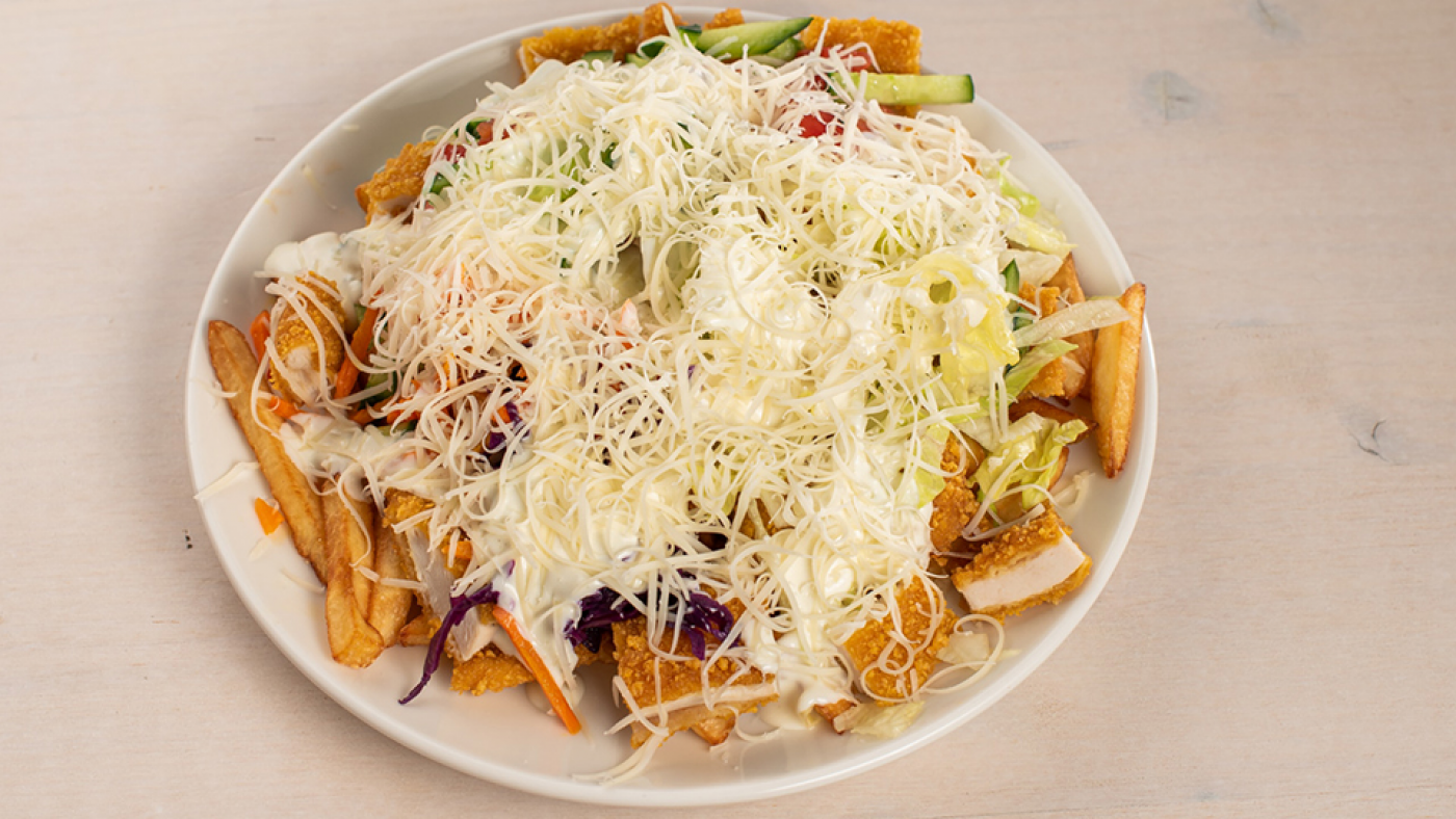 Ezt tartalmazza: corni (kukorica) panírban forgatott csirkehús, köret (válaszd ki lent, hogy milyet szeretnél!), uborka, paradicsom, tartármártás, sajt